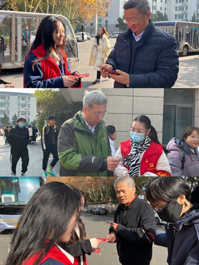 在活动期间,党员志愿者们热情饱满地向广大师生积极宣传十九届六中全会精神,阐明“两个确立”“两个维护”的重大意义和实践要求。宣传活动得到师生群体的热情回应,金太军教授、孙宁教授等专家学者也饶有兴趣驻足了解。