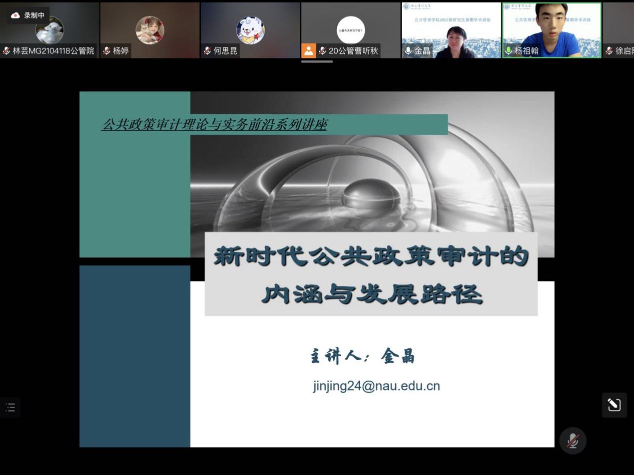 2022年7月18日上午,a片直播网 公共管理学院党委书记金晶为2022级研究生新生开展题为“新时代公共政策审计的内涵与发展路径”的学术讲座。此次讲座为公共管理学院暑期研究生新生系列培训项目之一,旨在提升研究生学术素养,拓展学术研究视野。讲座采用线上方式进行,公共管理学院2022级研究生参加了此次讲座,讲座由公共管理学院研究生会主席曹听秋主持。