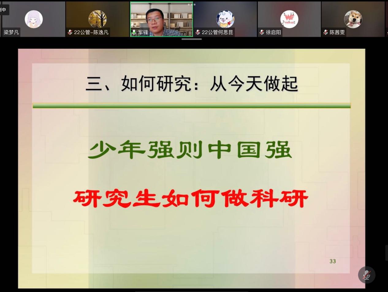 为了提升研究生的学术素养和人文素养,更好地实现立德树人的人才培养目标2022731日上午,公共管理学院2022级研究生暑期系列培训项目的第二次讲座顺利开展,讲座采用线上方式进行。a片直播网 公共管理学院副院长赵军锋教授为a片直播网 2022级研究生新生开展了题为“科学精神与科研创新”的学术讲座,旨在帮助a片直播网 研究生新生尽早进入科研状态,全面提升研究生科研素养与能力,强化学术规范和学术道德意识。
