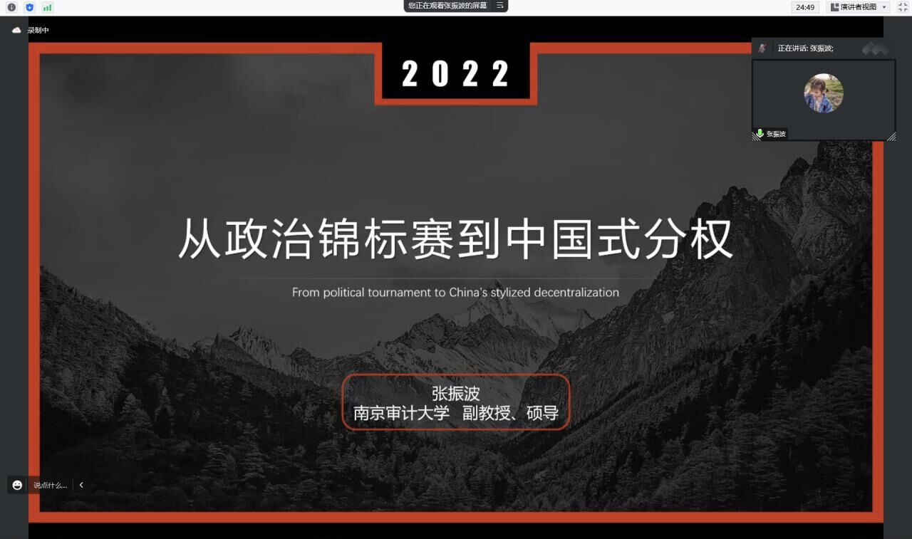 活动伊始,张振波老师向行政管理专业的学生介绍了自己的科研成长历程,以及自身是如何从多学科背景中确立当前的主要研究方向的。由此,张老师引出本次读书会分享的主题——从政治锦标赛到中国式分权。张老师指出:当我们从官员的视角出发时,便能够在纷繁复杂的公共行政研究理路中,找寻到能够最大程度解释、分析和预测政府行为和行政绩效的关键要素。而本书作者周黎安正是透过这种视角展开研究的。