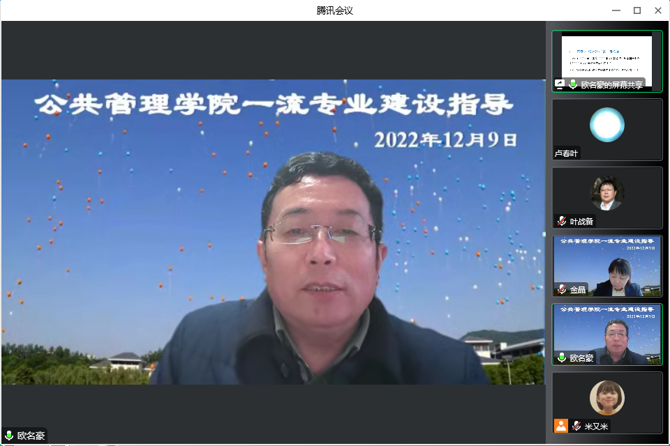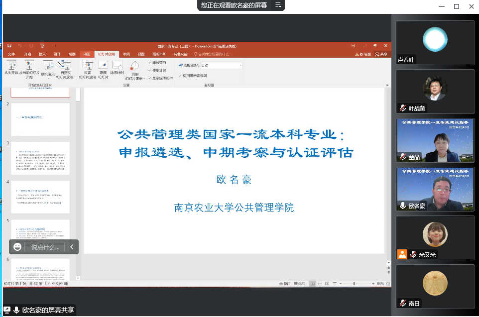为更好开展a片直播网 行政管理、劳动与社会保障专业的国家一流专业建设工作,12月9日下午,a片直播网 邀请南京农业大学欧名豪教授面向全院教师开展了国家一流专业建设线上指导讲座。讲座由学院党委书记金晶主持。