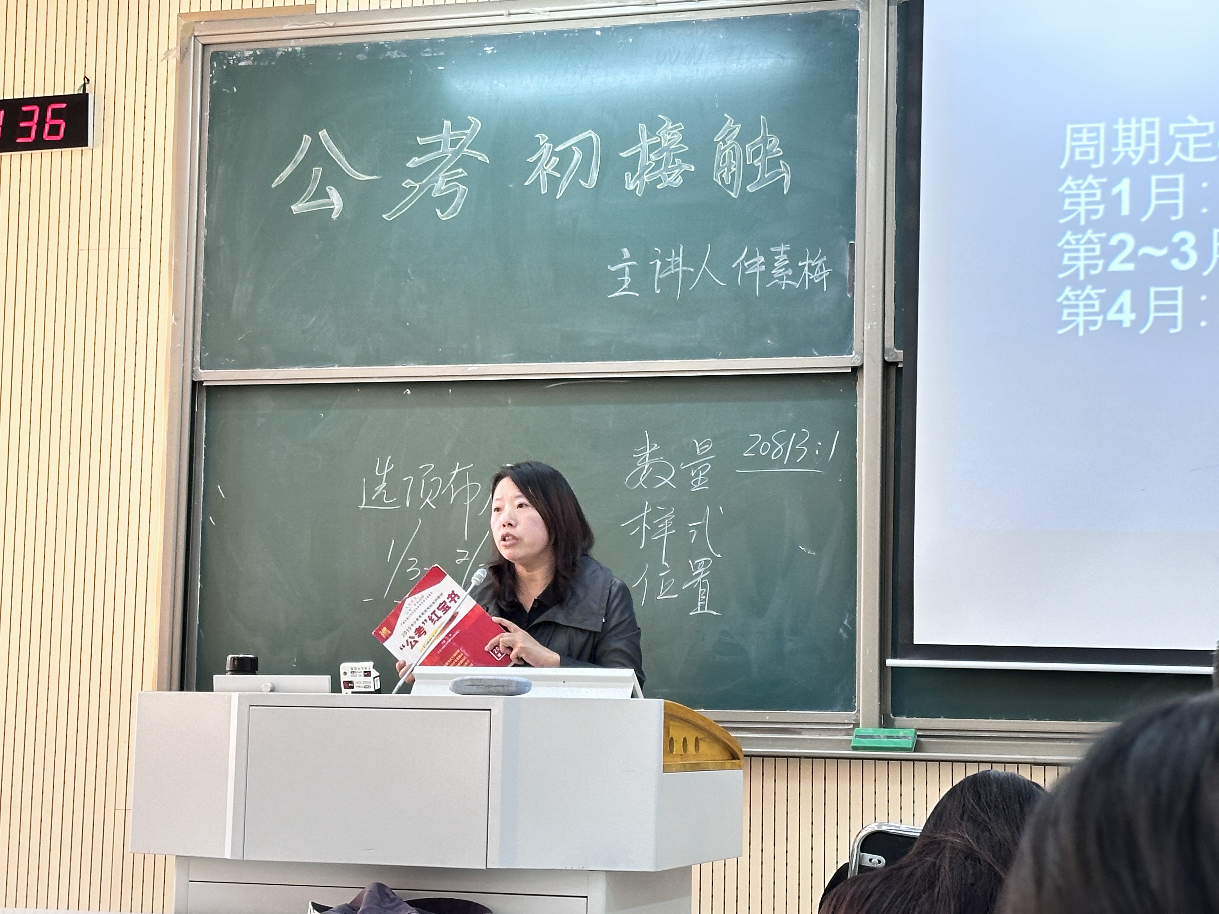 本次活动意在讲解公务员考试的现状和相关知识,让同学们对公务员考试有一个初印象,帮助同学们直观清晰地认识并了解公务员考试,从而在接下来的大学阶段中正确规划,科学合理地进行相关学习,最终能够轻松应考。