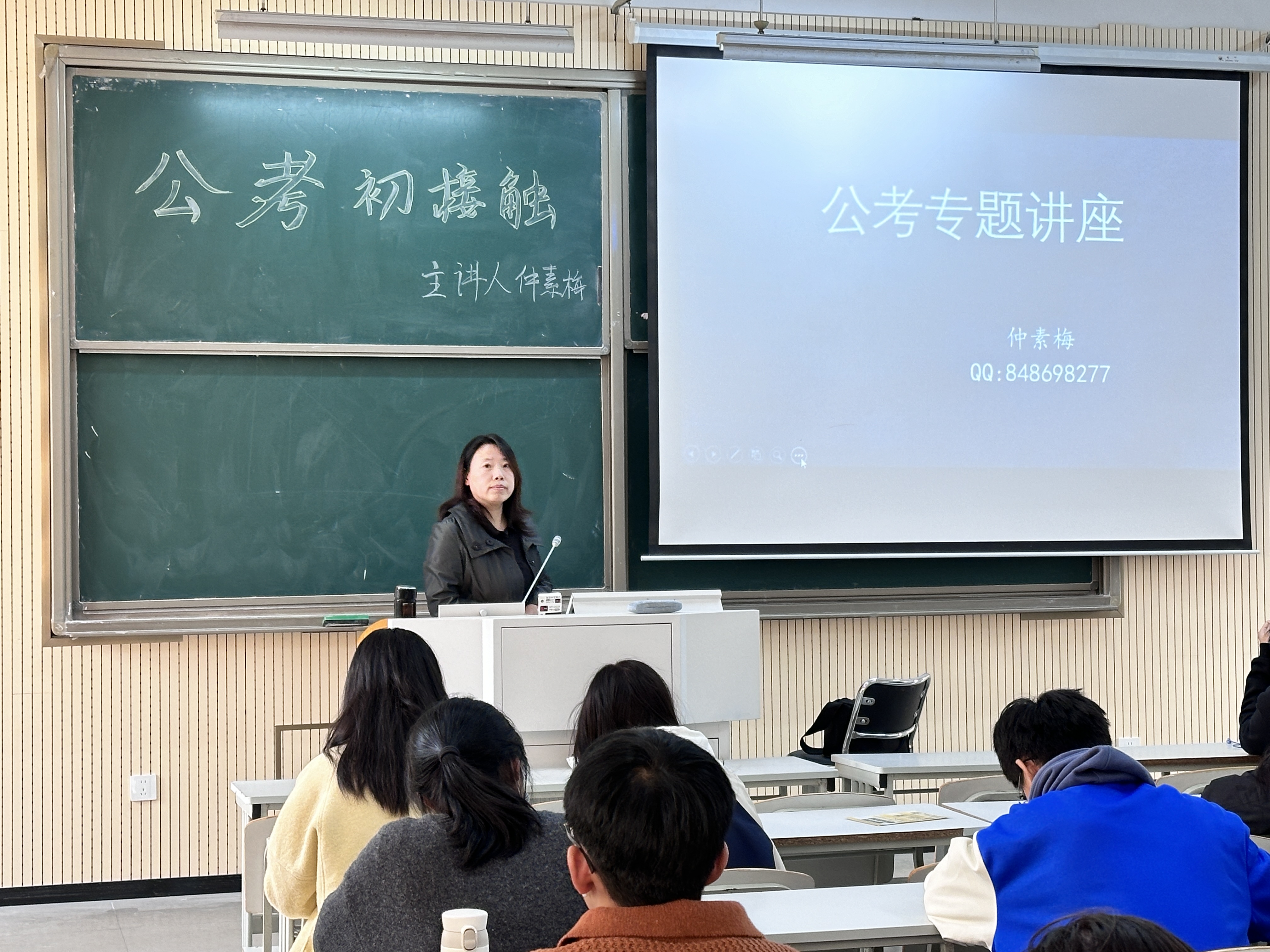 2023年11月23日下午13:30,由a片直播网 公共管理学院学生会主办的“公考初接触”讲座以线下形式顺利开展,本次讲座诚邀公共管理学院仲素梅老师主讲,主要面向有意向了解和参与公务员考试的同学。